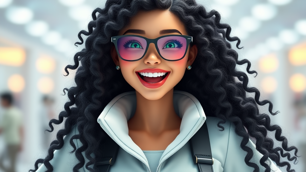 A 3D cybergirl with a joyful expression, laughing with her hands confidently placed on her hips. She sports sleek, futuristic glasses that frame her vibrant green eyes. Her long, luxurious black curly hair cascades down her shoulders, rendered in meticulous detail. The futuristic style is evident in her attire and overall design, showcasing an ultra-detailed and high-quality 8k render. Bright front lighting highlights her features, giving a dynamic and lively appearance. The scene captures the essence of a futuristic world, focusing on her expressive face and a sense of lively energy, while maintaining the original theme and quality inspiration from niji 5.