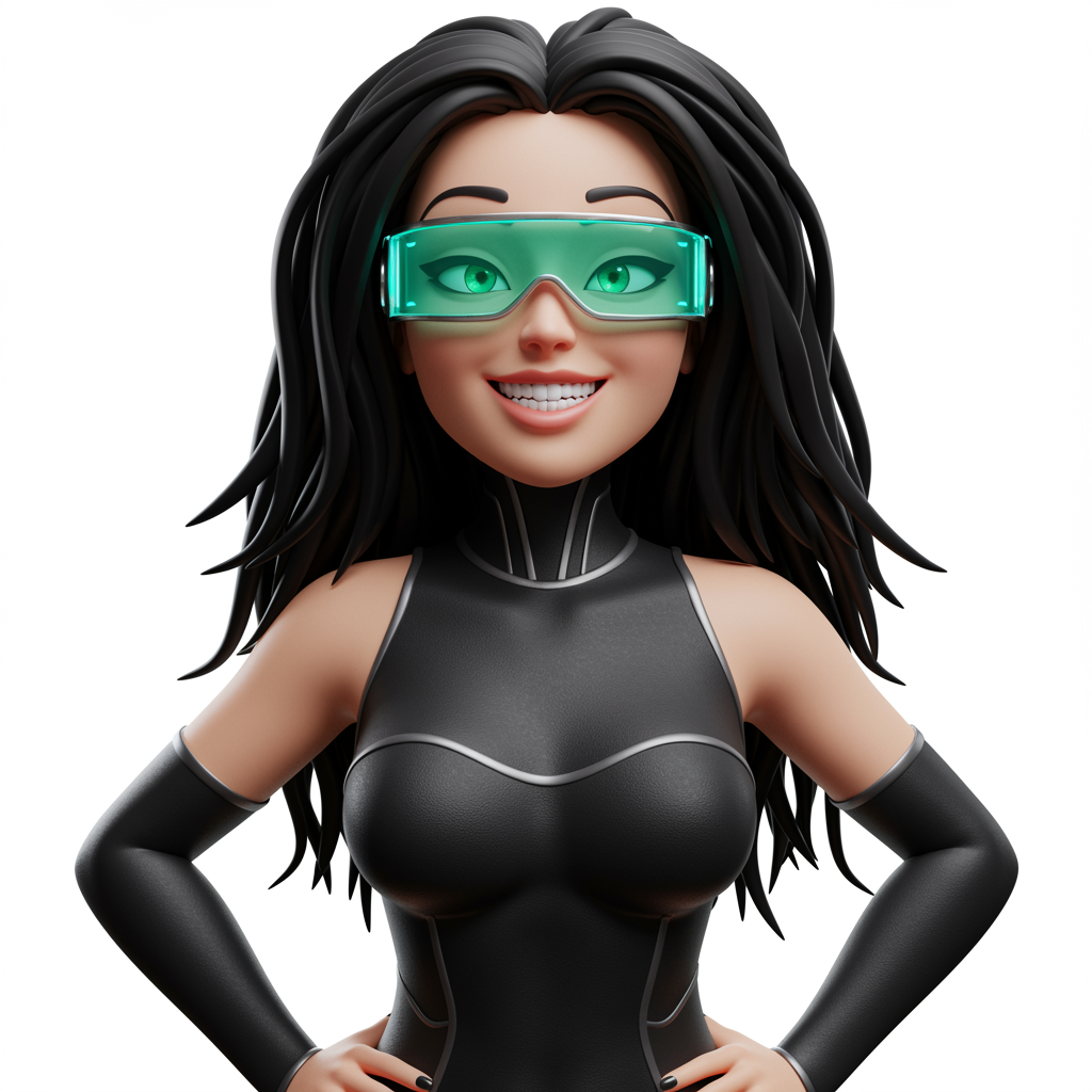 A 3D cybergirl with a wide smile, hands confidently on her hips, wearing sleek, futuristic eyewear over her vibrant green eyes. Her long, intricately curled black hair cascades down her back. Rendered in ultra-high detail with a focus on her expressive face, the scene captures the essence of futuristic style. The bright, front-facing lighting highlights her features, showcasing an 8k quality render in a vivid and energetic manner. The absence of a background emphasizes her presence and design, drawing attention to the immaculate details of the OC render.