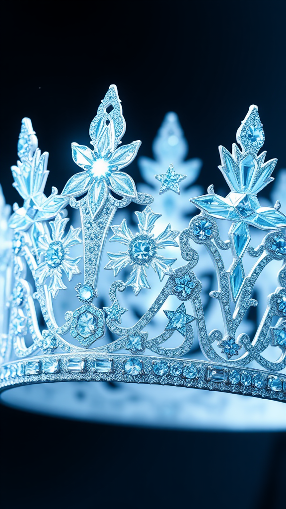 A 3D fairytale-inspired princess crown, reminiscent of Disney's Frozen, designed with Philippe Starck's modern touch. The crown glistens with sparkling gemstones, capturing the essence of icy elegance. Delicate snowflake patterns intertwine with abstract shapes, creating a magical aura. Soft blues and silvers dominate the color palette, while luminous highlights emphasize its ethereal glow, evoking a sense of enchantment and royal sophistication.
