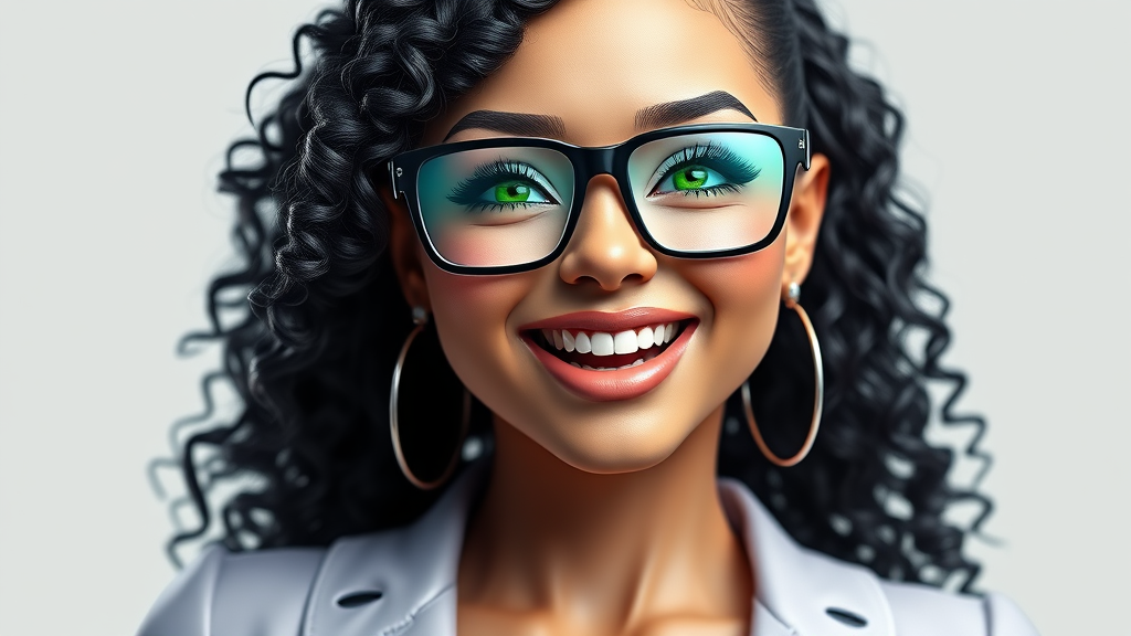 A 3D futuristic cybergirl with infectious laughter, her hands confidently on her hips, wearing sleek, stylish glasses. Her face is exquisitely detailed with vibrant green eyes and cascading, long black curly hair. The render captures her in a stunning 8k quality without any background, focusing on a bright frontlight that accentuates her features. The ultra-detailed scene showcases her in a vibrant, high-tech style, emphasizing intricate textures and a lively expression.
