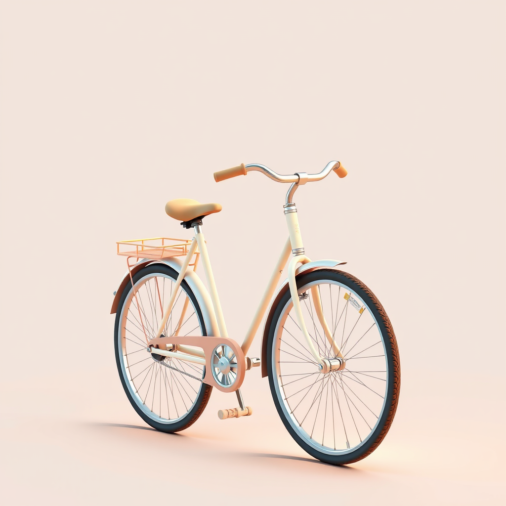 A 3D icon design featuring a vintage bicycle, bathed in soft, nostalgic light. The colors are a blend of pastel and vintage tones, evoking a sense of timelessness. The bicycle itself has classic elements reminiscent of a bygone era, with delicate detailing that reflects the artistry of Jerry Pinkney. The background is clean and neutral, allowing the bicycle icon to stand out while maintaining a harmonious and muted aesthetic. The image conveys a gentle, nostalgic feeling, bringing to mind leisurely rides on quiet, sun-dappled streets.