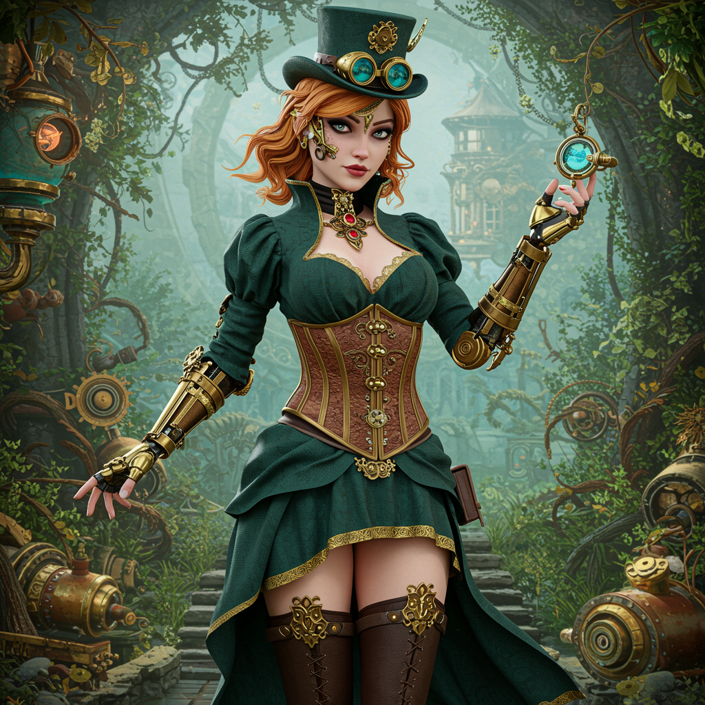 A 3D image of a steampunk woman inspired by Bella Kotak, showcasing a fusion of gold and cyan hues with photorealistic detail. She embodies elements of dark fairy tales and detailed miniatures in the style of Artgerm. The image captures the essence of steampunk with intricate, well-crafted accessories and attire. Her gaze is both intense and inviting, perfectly balanced eyes that reflect an adventurous spirit. She stands in a dynamic pose, highlighting her elegant silhouette and the intricate design of her mechanical enhancements, which seamlessly integrate with her natural form. The environment is a whimsical blend of fantasy and reality, featuring elaborate machinery and lush, surreal landscapes. Despite being highly detailed and vibrant, the composition remains harmonious and well-centered, drawing the viewer into a world of steampunk wonders. The overall image is of high quality and free from any imperfections or artifacts, offering a truly immersive visual experience.