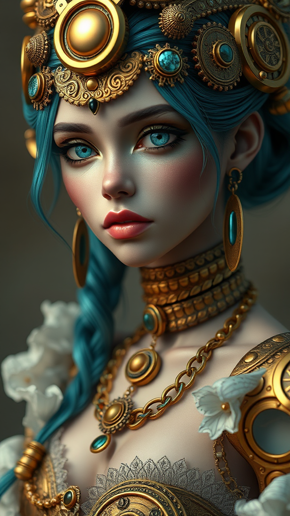 A 3D image of a steampunk woman inspired by dark fairy tales, rendered in the style of Bella Kotak with gold and cyan hues. Capture photorealistic detail, focusing on intricately designed miniatures. This piece draws from artgerm's influence, producing an ultra-high-definition image that embodies a unique blend of fantasy and reality. The character should possess an air of mystery and elegance, with a slightly fantastical anatomy that hints at otherworldliness while maintaining enchanting symmetry. Use a soft, muted background to enhance the subject's striking appearance, steering clear of excessive detail that distracts from the central figure. Maintain clarity and precision, avoiding elements that detract from the visual experience, aiming for a flawless portrayal of imaginative beauty.