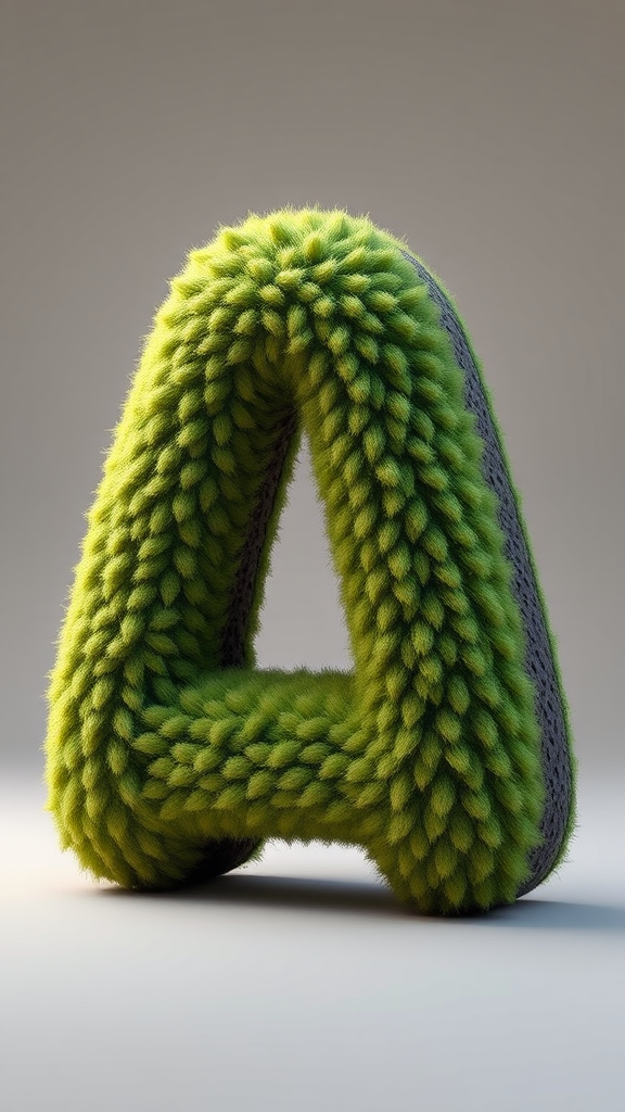 A 3D letter A crafted with a rich, realistic avocado texture, featuring a fluffy and tactile appearance, rendered in high quality using Blender and Unreal Engine, enhanced with dynamic volumetric lighting for striking visual depth, and subtly adorned with creative elements for added intrigue.