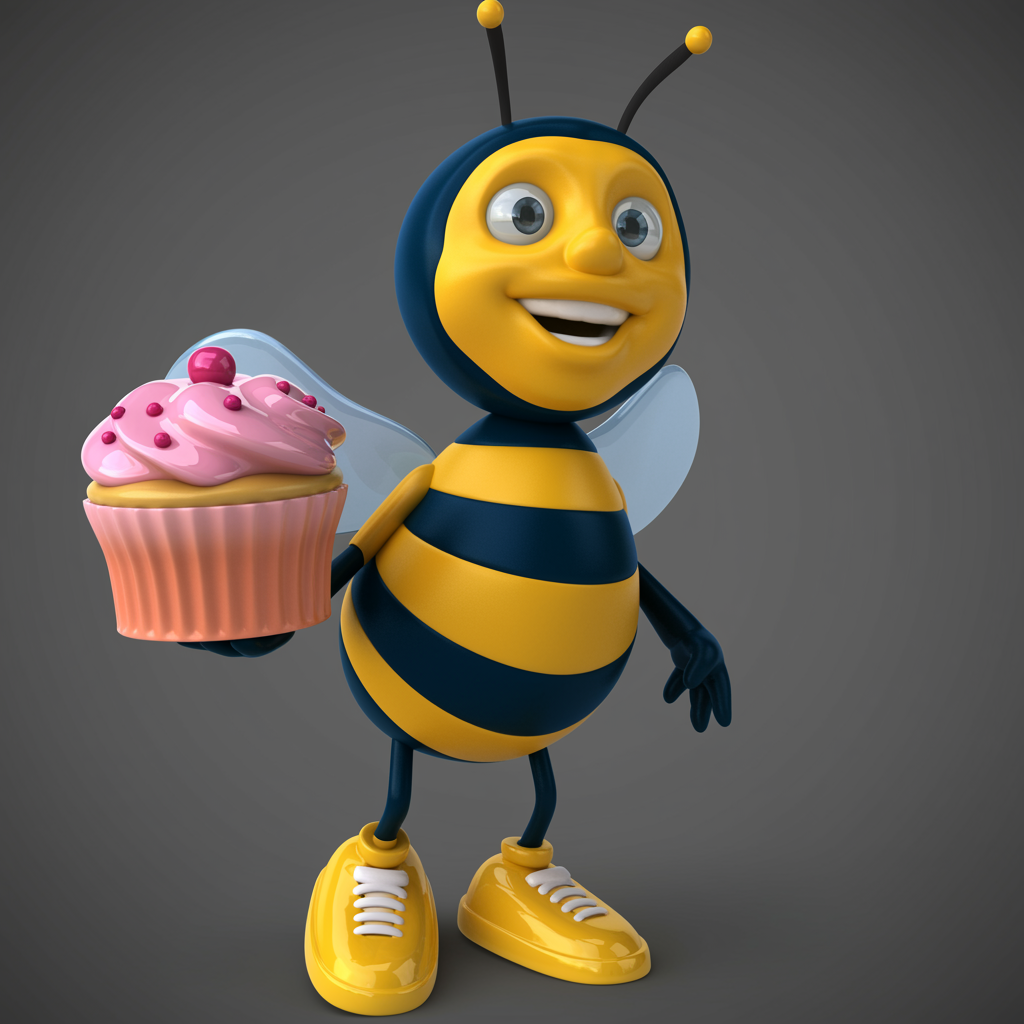 A 3D model of a whimsical cartoon bee in a bright yellow outfit cheerfully holding a cupcake, blending the playful and charming style of Ilya Kuvshinov and Seth MacFarlane with meticulous attention to detail found in photorealistic still lifes. The bee exhibits a distinct personality akin to charming character illustrations, balanced with the classic painterly touch of David Teniers the Younger. The scene is accentuated by the use of screen tones, highlighting its features in vivid 32k UHD resolution with a portrait aspect ratio. The overall scene combines an engaging sense of charm and humor with meticulous artistic detail.