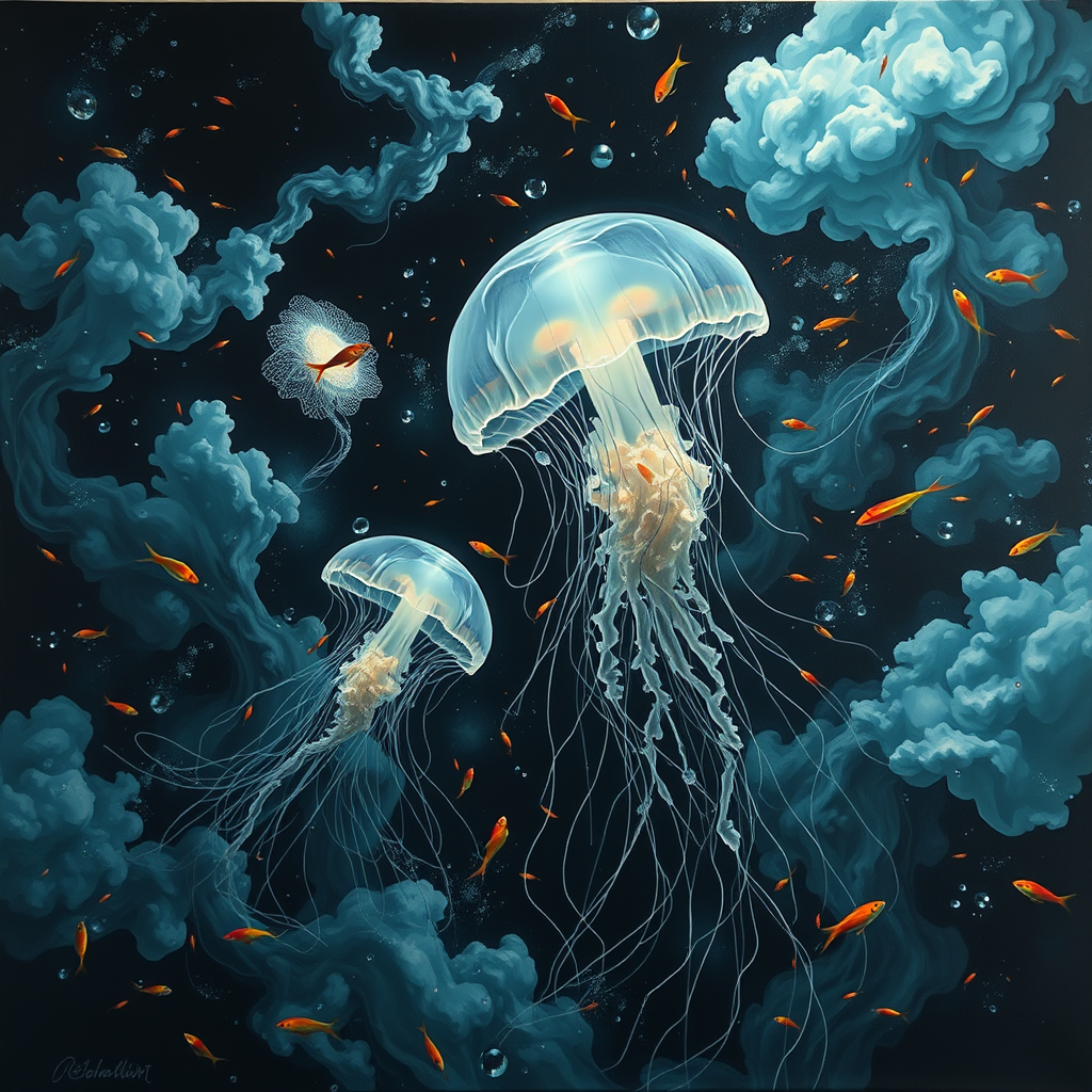 A 3D painting depicting ethereal jellyfish drifting through an aquatic dreamscape, surrounded by vibrant schools of colorful fish and wisps of atmospheric clouds. The scene embodies a dark and chaotic ambience, rendered in subtle hues of light black and luminescent aquamarine. The composition is intricate and fluid, reminiscent of animated gifs, yet possesses the texture of gossamer fabrics that evoke a sense of delicate motion. This site-specific work feels like it belongs in the realm of an artist's digital portfolio on Flickr, capturing the fluid and gestural essence of underwater ballet. The aspect ratio emphasizes the elongated dance of sea creatures in their natural habitat.