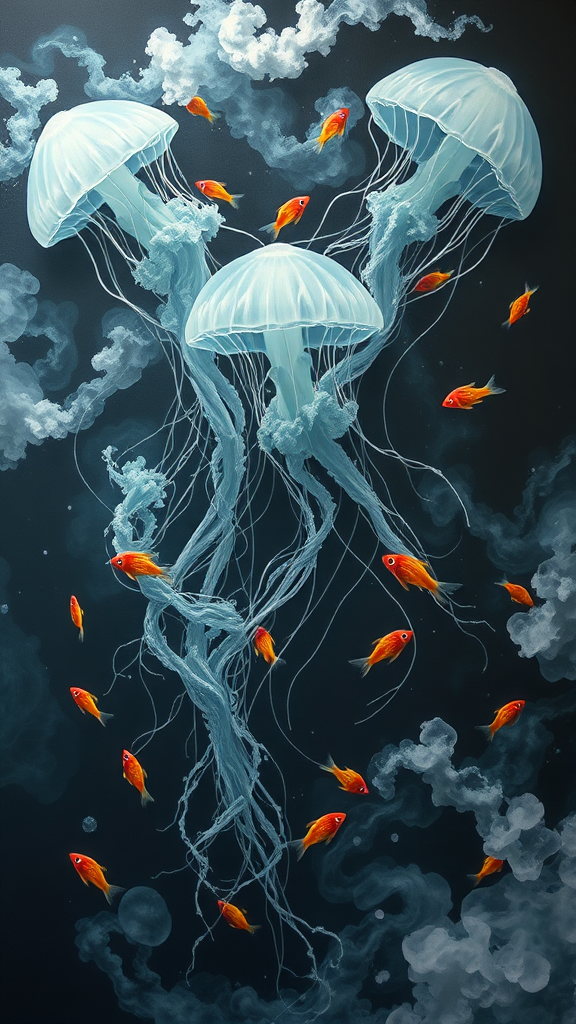 A 3D painting depicting ethereal jellyfish entwined with vibrant fish swimming amidst swirling clouds, all presented in a dark and chaotic style. Light black and light aquamarine hues dominate, creating a mesmerizing and fluid atmosphere. The scene is reminiscent of animated gifs, site-specific works, and the ephemeral quality of gossamer fabrics. The composition feels fluid and gestural, evoking the dynamic nature typical of art shared on platforms like Flickr. Brushstrokes mimic the flowing movements of sea creatures, pulsating with an otherworldly energy.