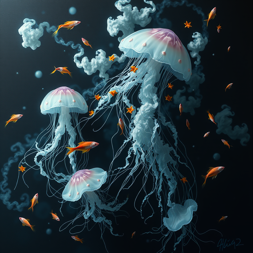 A 3D painting depicting ethereal jellyfish intertwined with vibrant, colorful fish and wispy clouds, rendered in a dark and chaotic style. The palette incorporates light black and soft aquamarine hues, evoking a sense of fluidity and gesture reminiscent of gossamer fabrics. The scene is animated, as if captured in a series of moving gifs, with site-specific elements that give depth and immersion, inspired by the dynamic, artistic essence of Flickr. The composition maintains an elongated aspect ratio of 35:52, enhancing its mysterious allure.