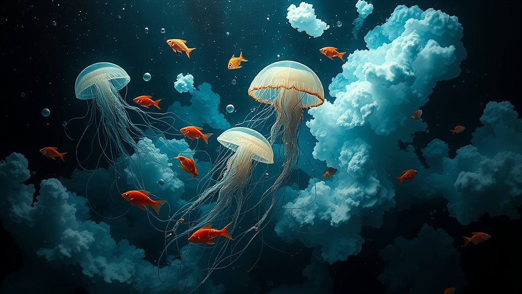 A 3D painting featuring ethereal jellyfish and vibrant fish swimming amidst surreal clouds, enveloped in a dark and chaotic ambiance of light black and aquamarine hues. The scene captures an animated quality, reminiscent of site-specific installations and fluid gestural art. The composition is layered with delicate gossamer textures, evoking the aesthetic of curated Flickr art galleries. The elongated aspect ratio of 35:52 further enhances the dreamlike, underwater world, making the elements appear as if they are in constant motion.