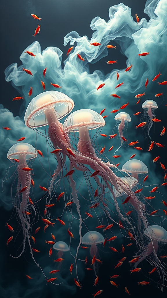 A 3D painting of ethereal jellyfish amidst vibrant, swirling schools of colorful fish, all set against a backdrop of smoky clouds rendered in a palette of pale black and soft aquamarine. The scene is dynamic, resembling animated gifs, with an atmosphere of controlled chaos and fluidity reminiscent of site-specific works. Wisps of gossamer fabrics intertwine gracefully, echoing the gestural brushstrokes popular in online art showcases. The composition is elongated, captured in an aspect ratio of 35:52, bringing a dreamlike, immersive quality to the narrative.