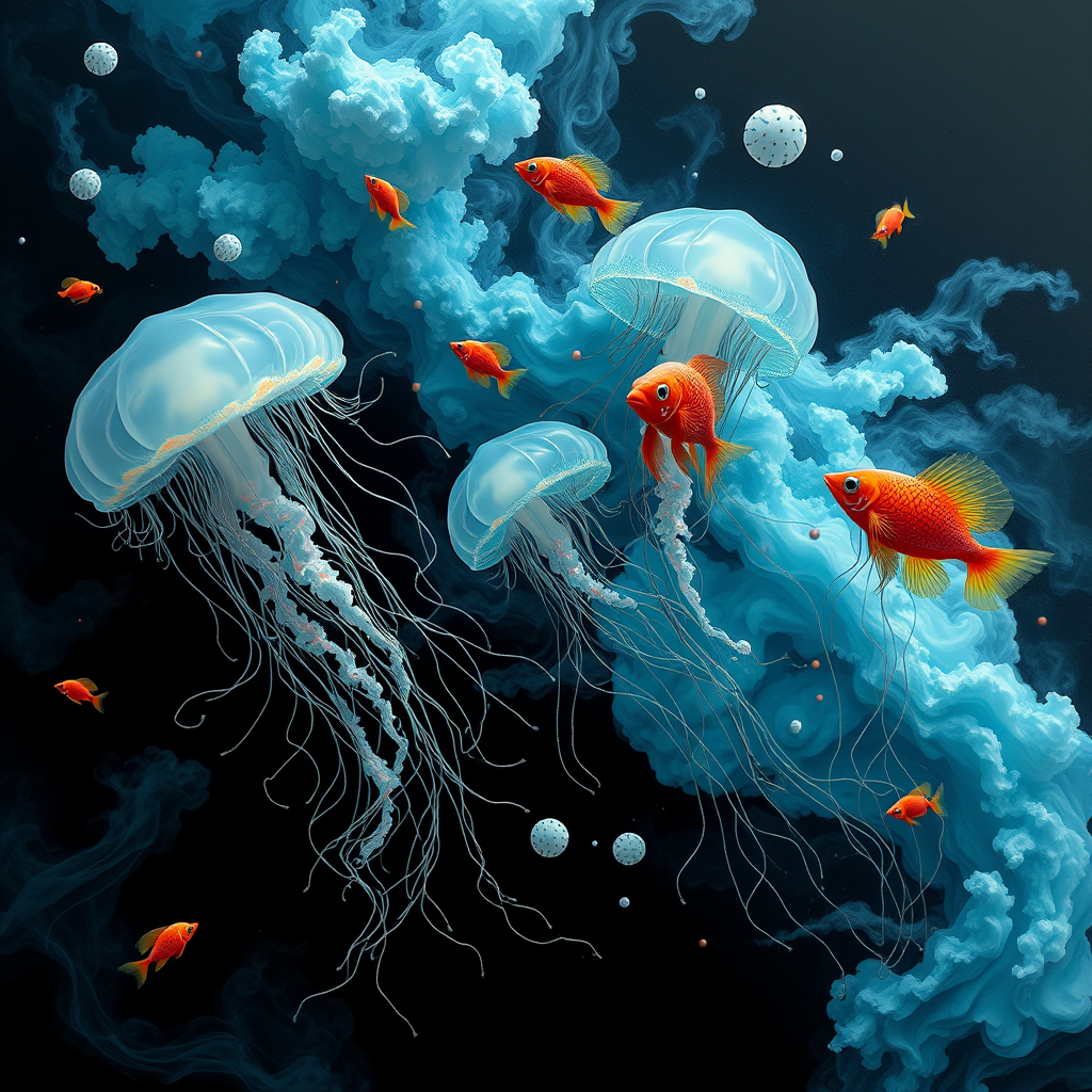 A 3D painting of ethereal jellyfish and vibrant fish swimming amidst swirling clouds, crafted in a dark yet chaotic style with hues of light black and aquamarine, animated in fluid, gestural motions. Inspired by site-specific works with gossamer-like textures, reminiscent of a flickr gallery, capturing a surreal underwater realm where every movement is a dance of color and light within the elongated aspect ratio of 35:52.