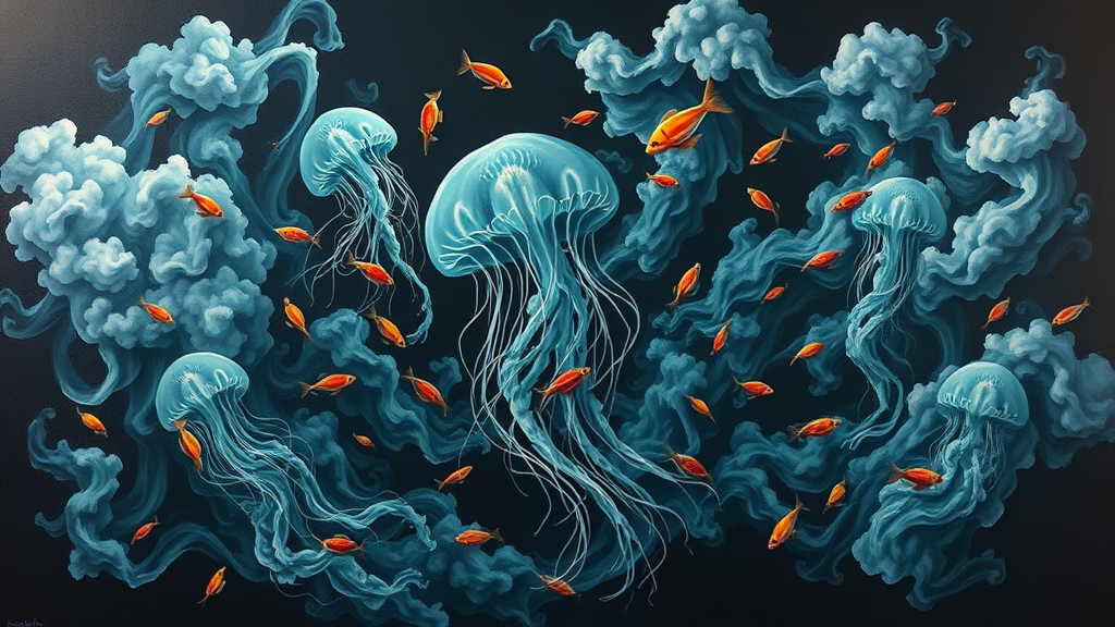 A 3D painting of ethereal jellyfish entwined with vibrant fish amidst swirling clouds, crafted in a dark and chaotic style, shaded with light black and aquamarine hues. The scene evokes the fluidity and motion of animated gifs, with artwork designed as a site-specific piece, incorporating gossamer fabrics that flutter like underwater silk. Inspired by Flickr's aesthetic, the composition is fluid and gestural, capturing a surreal underwater ballet.