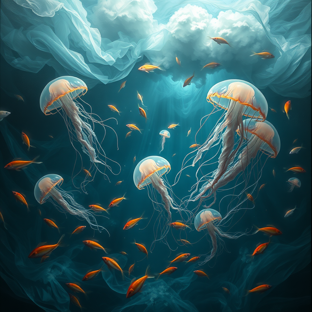 A 3D painting of ethereal jellyfish gliding amidst a swirling sea of vibrant fish, their colors dancing like flickering embers beneath a stormy cloudscape. The scene is enveloped in an atmosphere that merges dark chaos with gentle grace, rendered in shades of light black and aquamarine. Animated elements lend the composition a sense of fluid motion and gestural elegance, reminiscent of site-specific installations. The light filters through layers of gossamer fabric, casting a diaphanous glow over the tableau. This evocative imagery captures the spirit of a digital age, akin to the aesthetic of curated collections found on platforms like Flickr.