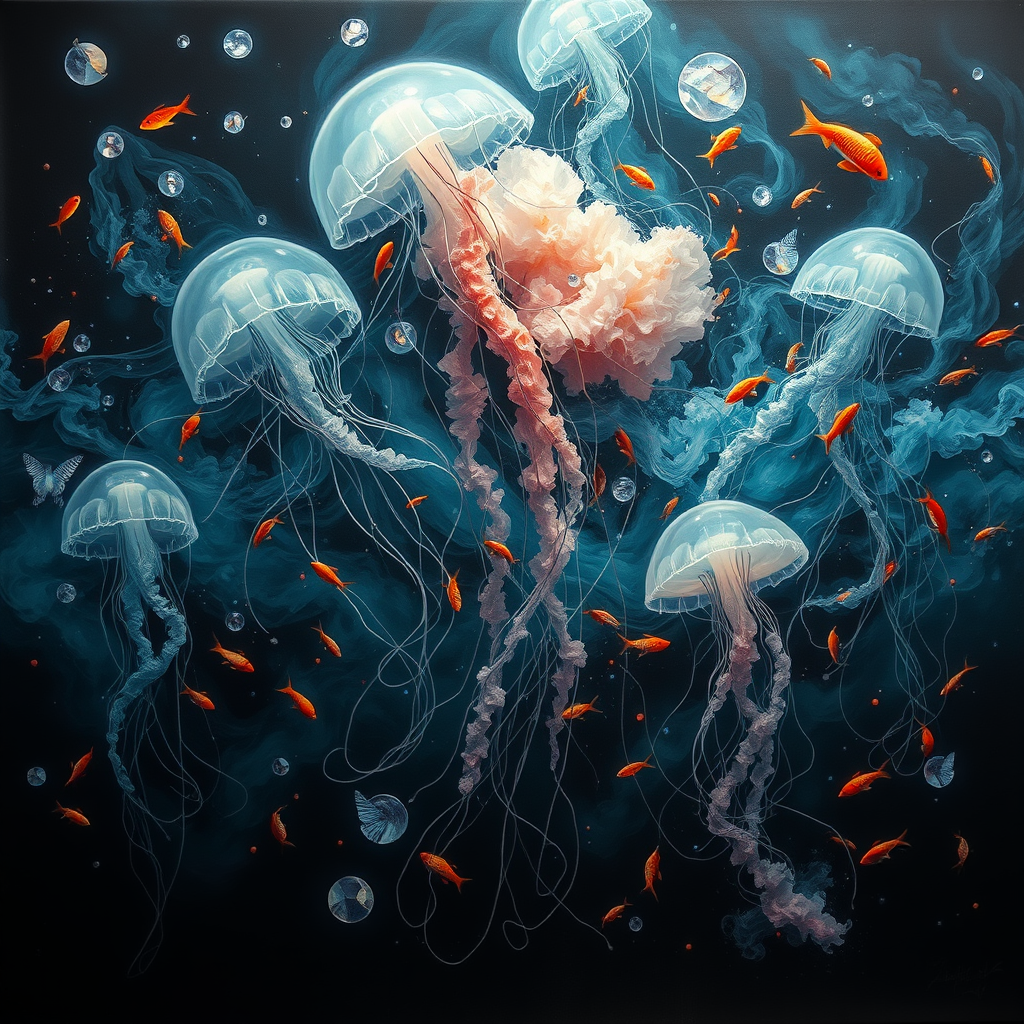 A 3D painting of ethereal jellyfish interwoven with vibrant fish and swirling clouds, blending into a dark yet chaotic ambiance. The scene is suffused with light black and aquamarine tones, bringing a fluid, gestural quality reminiscent of animated gifs. This site-specific artwork is enhanced by the delicate texture of gossamer fabrics, evoking a sense of motion and mystery akin to curated collections found on Flickr. The overall aspect ratio is long and narrow, inviting an immersive exploration of the dynamic underwater realm.