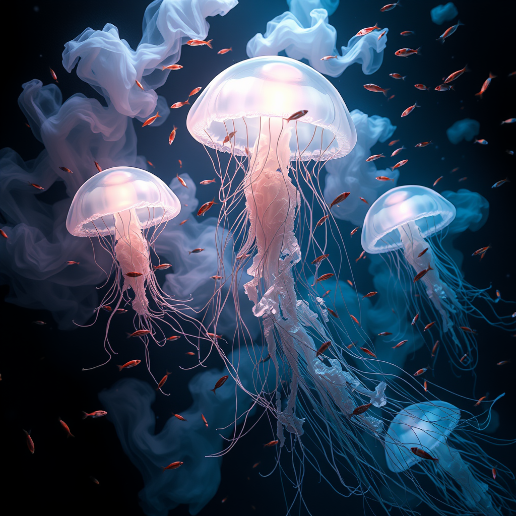 A 3D painting of luminescent jellyfish surrounded by vibrant schools of fish weaving through ethereal cloud formations, styled in a dark and chaotic theme with hues of light black and aquamarine. This animated gif captures the essence of fluid and gestural movements, akin to site-specific artworks. Translucent gossamer fabrics seem to ripple through the scene, invoking a sense of weightlessness. The design echoes the dynamic and spontaneous creativity found on platforms like Flickr, seamlessly blending motion and stillness in a surreal underwater dance.