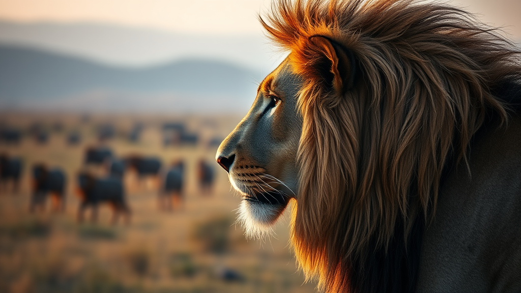 A 3D photorealistic image capturing the majestic side profile of a lion in the Serengeti, intensely focusing on its regal mane and piercing gaze. The scene is reminiscent of the style of Frans Lanting, achieved using a Canon EOS R3 with a 70-200mm lens, ensuring the lion fills the entire frame. The image is in high resolution, portraying the intricate details of the lion's fur and the rich textures of the African landscape, adding a slight dawn glow to enhance the serene environment, with a touch of stylized drama for a more captivating effect.
