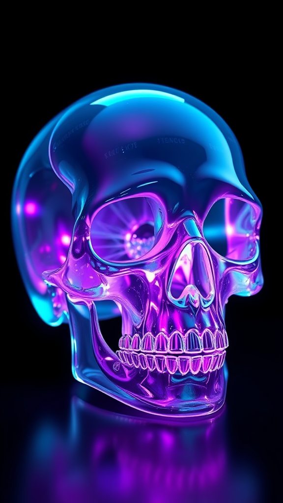 A 3D realistic image of a crystal-clear glass skull with a soft purple and teal light illuminating from within, casting ethereal reflections and refractions against a deep black backdrop. The rendering, achieved with the high-performance Octane engine, highlights the skull's smooth, intricate textures, producing a mesmerizing interplay of glowing colors. With a mysterious and futuristic ambiance, the image evokes a sense of wonder, blending elements of science fiction with an almost otherworldly allure.