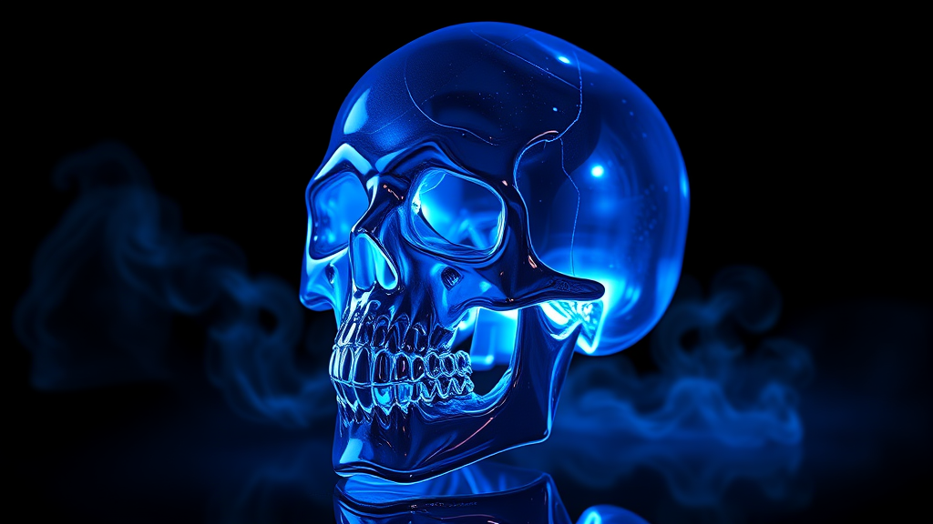 A 3D realistic image of a glass skull with indigo light pulsating through it, casting a soft glow and showcasing its transparent nature. The black background enhances its illuminated presence, and the rendering with Octane Engine accentuates intricate reflections and refractions, imbuing the image with an enigmatic and futuristic aura. Wisps of ethereal mist swirl around the skull, adding an extra layer of mystery and depth to the scene.