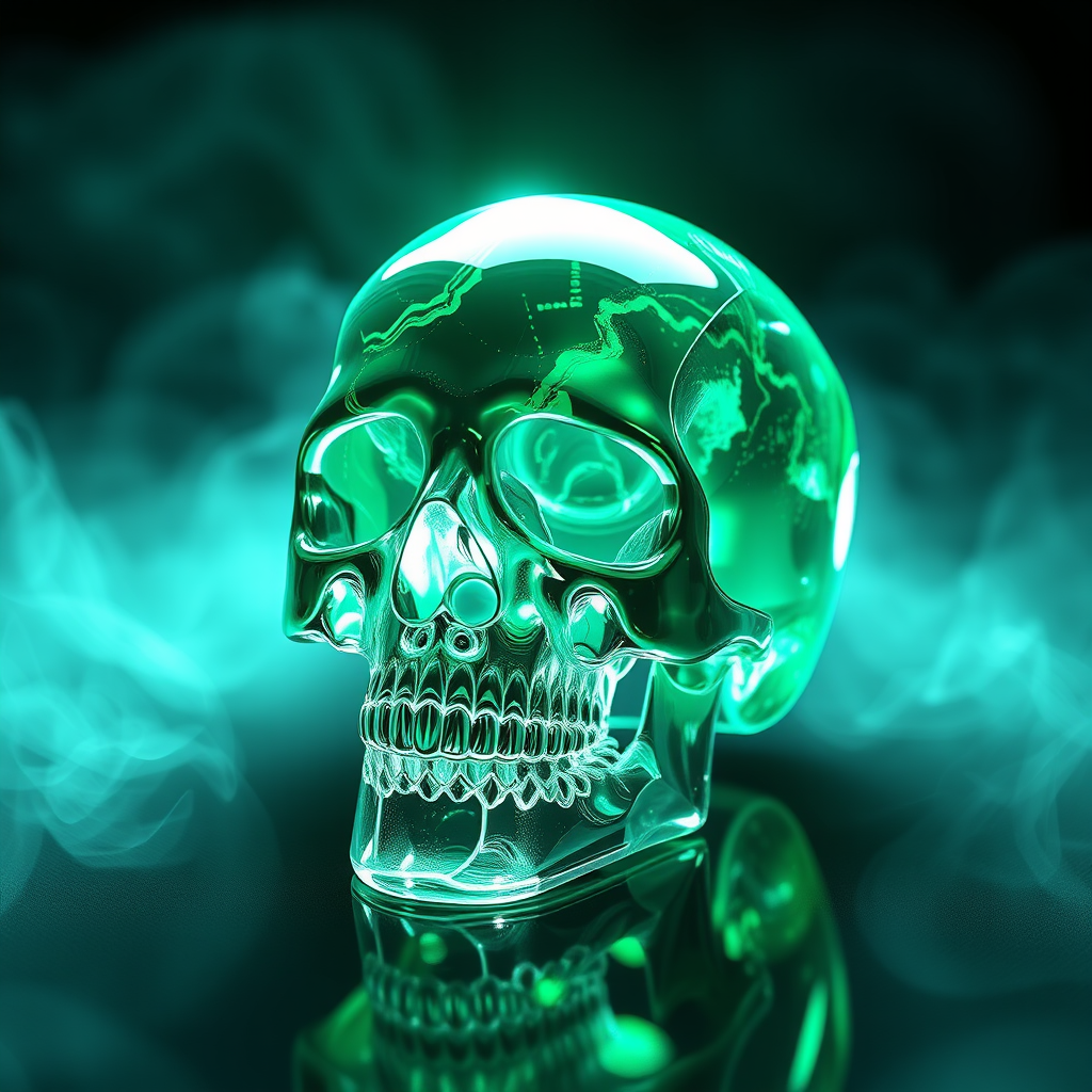 A 3D realistic rendering of a crystalline skull crafted from clear glass, with emerald green light radiating through, casting intricate reflections and refractions. This creates a glowing, semi-transparent effect on a deep, void-like backdrop. The image is rendered with Octane, showcasing its hallmark capability of producing lifelike, mesmerizing visuals. The scene evokes an enigmatic and futuristic aura, with ethereal mist swirling around, accentuating the skull's otherworldly presence.
