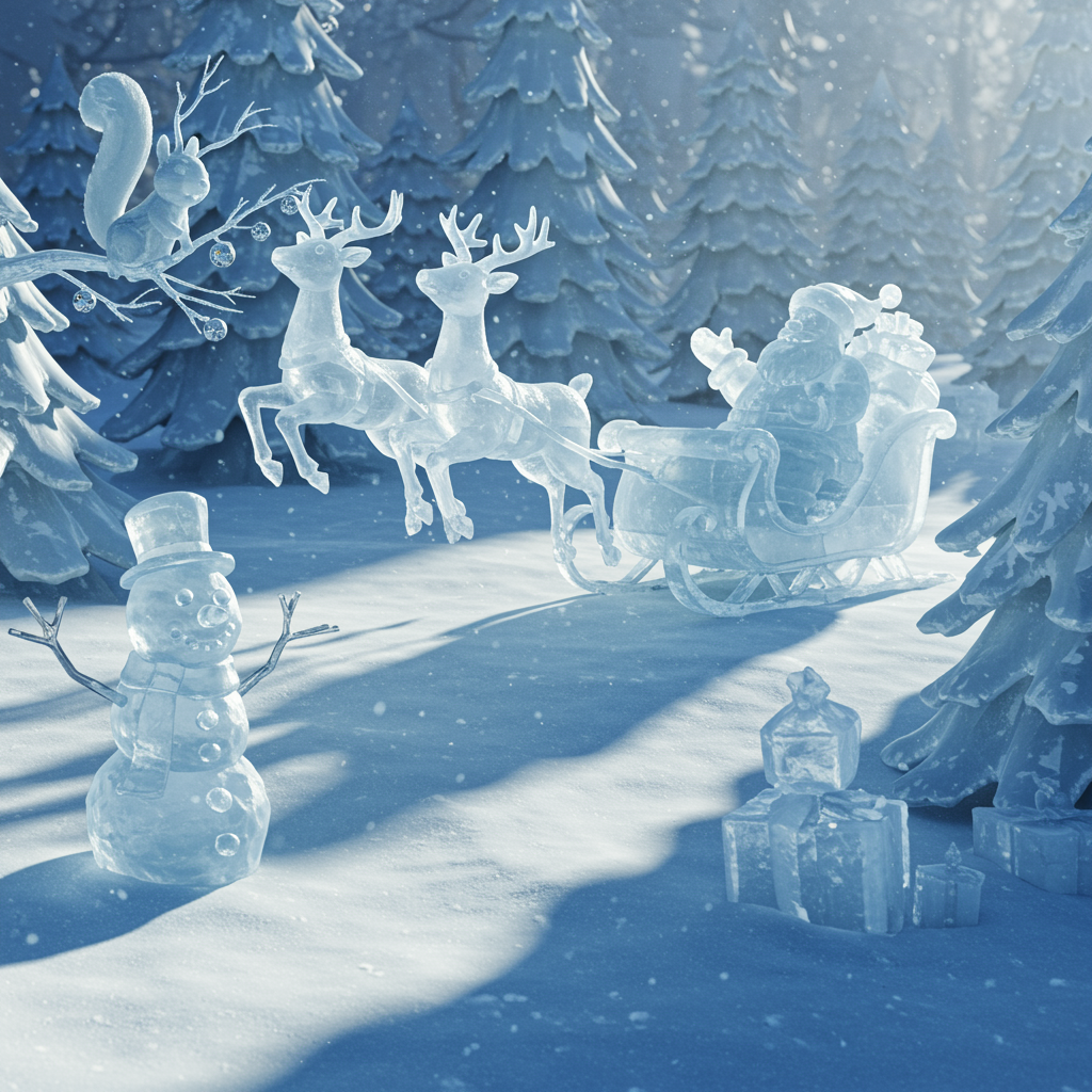 A 3D render of a photorealistic Disney Pixar-style scene features a magical winter forest crafted entirely from ice. In the heart of this enchanting landscape stands an intricate ice sculpture of Santa seated in an elaborately carved sleigh, pulled by a team of elegant ice reindeer mid-gallop. Nearby, an amusing ice snowman, smiling and whimsical, adds a touch of joy. A curious squirrel perches on a frosted branch of a sparkling Christmas tree, its bushy tail curled in surprise. The ice figures boast intricate details and flawless designs, creating a mesmerizing visual spectacle. Light dances across the snow, casting lively shadows that ripple with the figures' dynamic poise. The scene exudes a tranquil, mystical aura, embodying the perfect setting for a holiday where every element glistens with icy brilliance.