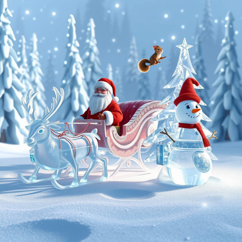 A 3D render of a photorealistic image in a Disney Pixar style depicts a magical snowy forest crafted entirely from shimmering ice. In this enchanting scene, intricate ice sculptures portray Santa in a gracefully detailed sleigh pulled by a team of elegant ice reindeer. Nearby, a jovial ice snowman adds charm with its whimsical expression. A curious squirrel perches atop a glistening ice Christmas tree, casting delicate shadows on the snowy ground. The ice figures boast complex details and perfect shapes, creating a breathtaking visual spectacle. The scene is animated with a sense of movement, as light dances on the snow, illuminating the surroundings in a dreamlike glow. This idyllic setting is both serene and mythical, evoking a fabulous winter wonderland where every element is intricately made of ice, offering a perfect backdrop for a festive holiday atmosphere.