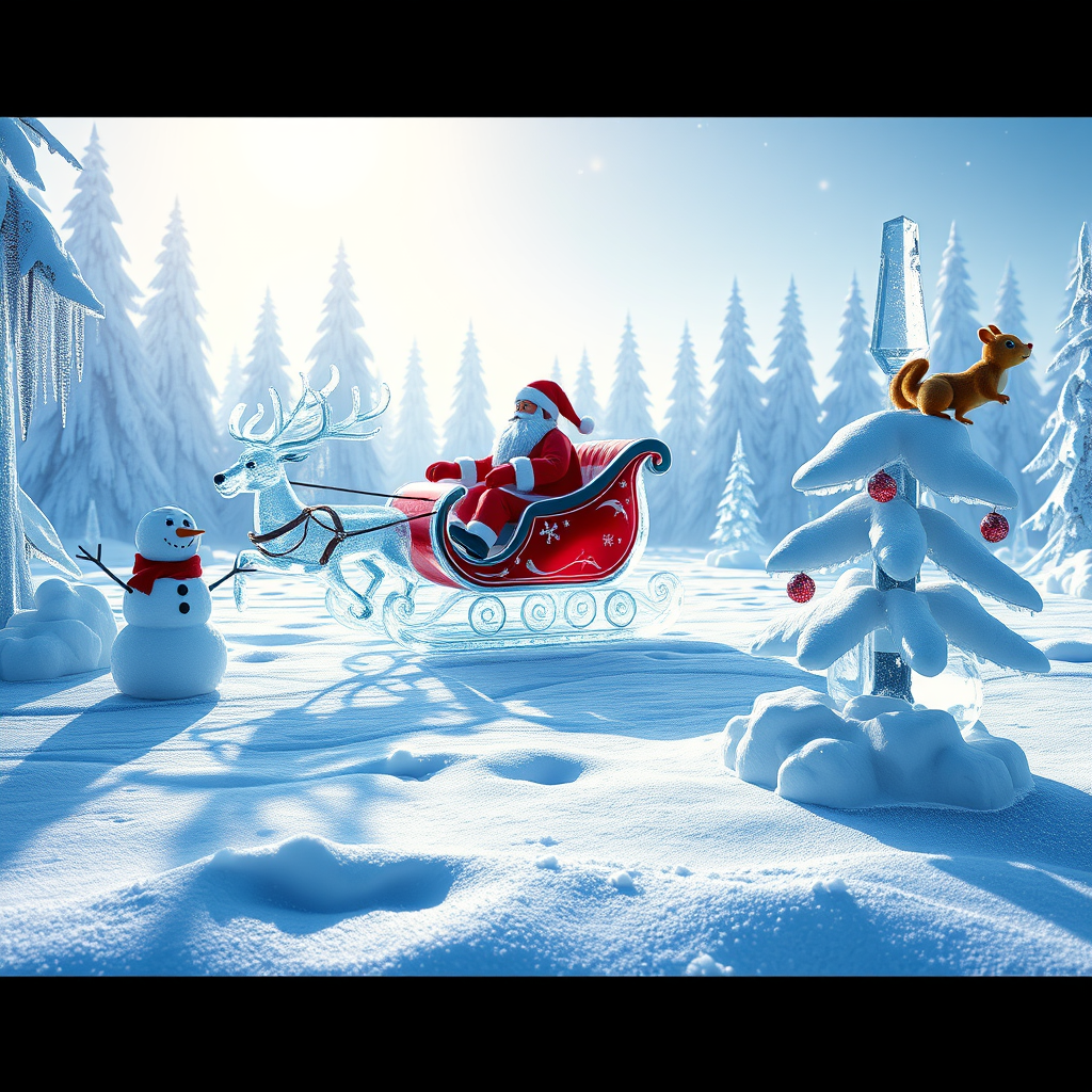 A 3D render of a photorealistic image in a Disney Pixar style, featuring a snowy enchanted forest crafted entirely from ice. Majestic ice sculptures of Santa in an intricately detailed ice sleigh, drawn by elegant ice reindeer, glide through the scene. An amusing ice snowman adds a whimsical touch. Nearby, a joyful squirrel perches on an icy Christmas tree adorned with sparkling icicles. The ice sculptures boast intricate details and flawless craftsmanship, creating a mesmerizing visual spectacle. Light dances across the snow, casting lively shadows from the sculptures onto the glistening ground. The atmosphere is serene yet magical, evoking a sense of wonder and ideal holiday spirit, where every element is beautifully carved from ice.
