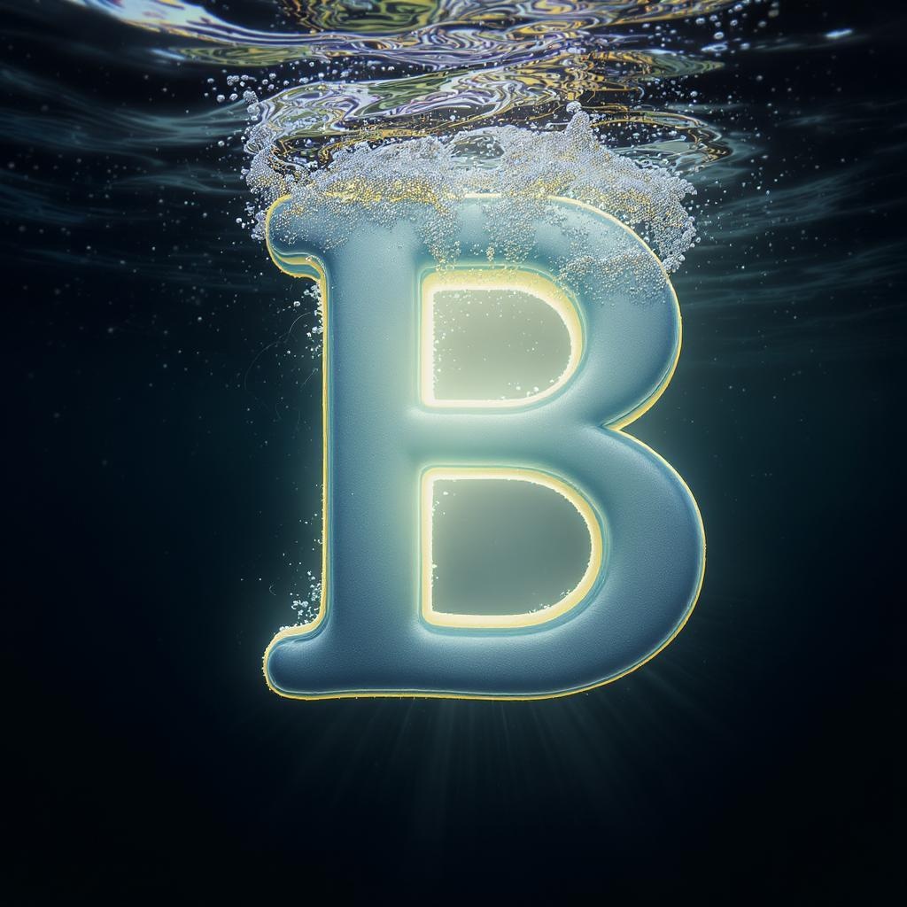 A 3D render of a single alphabet letter, featuring a seamless blend of periwinkle and canary yellow hues, submerged beneath swirling water currents. Bright, luminous light radiates from the center, creating an eerie yet mesmerizing atmosphere. The scene showcases photorealistic detail, capturing the rippling water surface and liquid-like effects with hyper-detailed water textures. Dramatic lighting enhances the 8K resolution, with an emphasis on high contrast and a surreal ambiance.