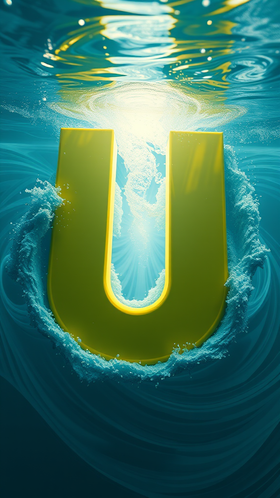 A 3D render of the letter, featuring a blend of periwinkle and canary yellow colors, submerged in water with swirling currents. Bright light radiates from its center, creating a high-contrast, eerie atmosphere. The photorealistic rendering showcases a rippling water surface with a liquid effect and hyper-detailed textures. Dramatic lighting casts over the scene, captured in stunning 8K resolution, accentuating the immersive underwater environment.