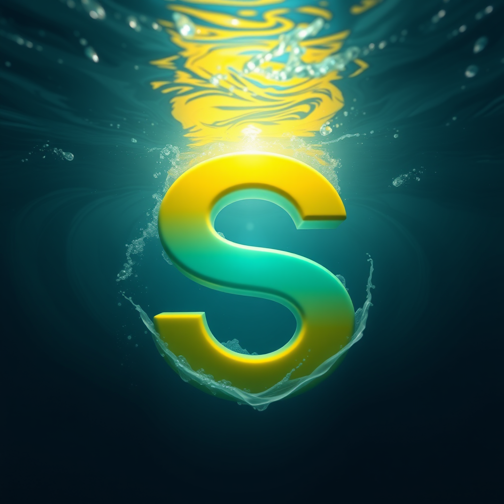 A 3D render of the letter, featuring a periwinkle and canary yellow gradient, submerged beneath swirling water currents. Bright light radiates from the center, casting an eerie yet mesmerizing atmosphere. The scene is photorealistic with a rippling water surface and liquid effects, showcasing hyper-detailed water textures and dramatic lighting. Captured in 8K resolution with a 9:16 aspect ratio, the image maintains a raw, personalized style while subtly enhancing the depth and fluidity of the underwater environment.