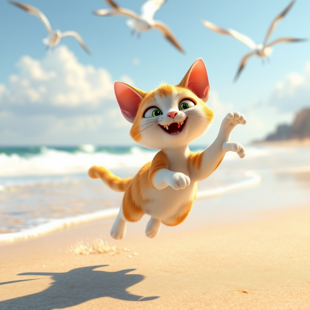 A 3D rendered scene of a playful cat frolicking along a sunny beach, capturing the enchanting animation style reminiscent of "Finding Nemo." The cat's expressive face is full of curiosity and delight, perfectly matching its graceful, whimsical movements. Vivid colors and a touch of cartoonish exaggeration enhance the bright, cheerful atmosphere. In the background, gentle waves lap at the shore, and seagulls soar overhead, adding to the lively and magical environment.