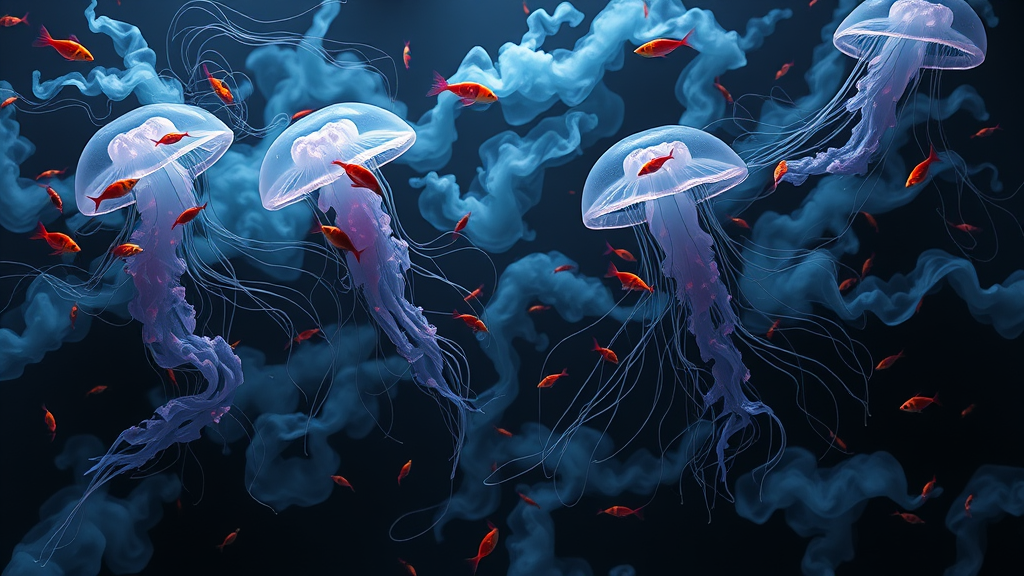 A 3D representation of ethereal jellyfish intertwined with vibrant fish and swirling clouds, capturing a dark yet chaotic ambiance in shades of light black and aquamarine. The scene unfolds with fluid gestures, reminiscent of floating gossamer fabrics, resembling an animated gif. The artwork exudes a dynamic, site-specific essence, inspired by the artistic aesthetic of Flickr imagery.