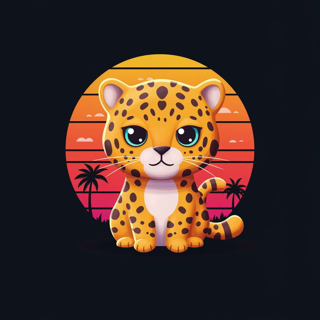 A 3D vector art design of a cute and quirky jaguar silhouette with sharpened, expressive eyes, set against a vibrant sunset background. The t-shirt art features bright, bold colors with a watercolor effect on a black background. The jaguar is rendered in a retro aesthetic with low-poly elements, soft lighting, and isometric style, viewed from a bird's-eye angle emphasizing the character. The overall design is photorealistic with a focus on charming details, created in 4K resolution using Cinema 4D, capturing a front-side view with creative modifications enhancing the original concept.