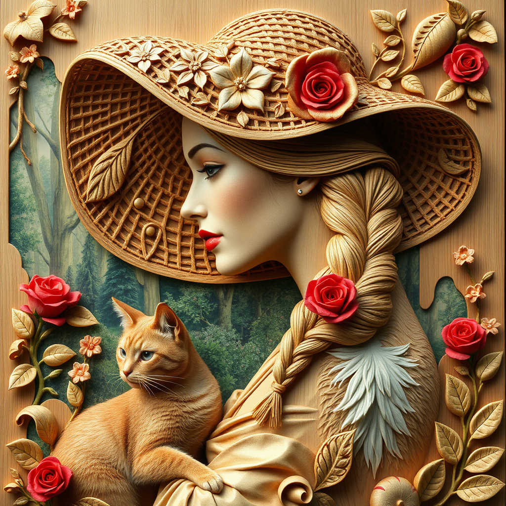 A 3D wooden relief art piece showcases a woman in profile, her serene face highlighted by a large, intricate straw hat adorned with delicate floral carvings that evoke a sense of elegance and artistry. She sits gracefully in a lush garden with her sleek, attentive cat by her side. Her long hair, elegantly tied in a braid, features an exquisite red rose nestled within. Her eyes, expressive and full of life, and her gentle facial features stand out against a vibrant background that suggests a dreamy, ethereal atmosphere. The backdrop reveals a mystical forest, adding depth and mystery to the scene, all rendered in stunning 4K detail.