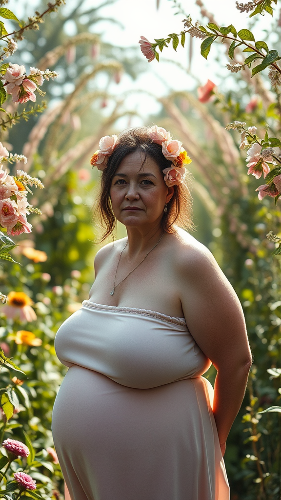 A 40-year-old woman with a baggy figure, adorned with flowers in her hair, stands in an ethereal garden. The scene is inspired by Anna Dittmann and captured with a Cinestill Hasselblad 85 mm tilt-shift lens at a Dutch angle. Soft lighting casts gentle shadows, highlighting her detailed and realistic features, including intricate skin texture and matte finish. The whimsical garden surrounds her in a photorealistic fantasy art style, exhibiting hyperrealistic and ultra-detailed qualities with an 8k resolution that follows the golden ratio. The composition is a masterpiece of high detail, with subsurface scattering enhancing the natural light play on her skin. The photograph, intended for studio photography, avoids issues like low resolution, ugly artifacts, or incorrect anatomy, ensuring the subject remains beautifully and accurately rendered within the frame.