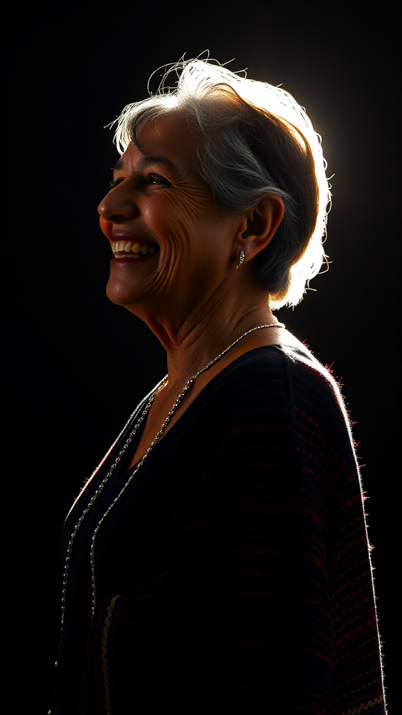 A 44-year-old Mexican woman stands full body, with a dark background and dramatic light casting a backlit rim effect around her silhouette. She is laughing, captured from the side, with a colorful poncho that appears subtly translucent, allowing glimpses of intricate textures in the weave. Adorning her are silver jewelry pieces that glint in the light. The image is in ultra-high resolution, capturing every detail of her skin imperfections and the glossy, highlighted intricacy of her eyes. The photo is sharp-focused and in HDR, presenting a raw, vivid scene without any artificial text or alterations.