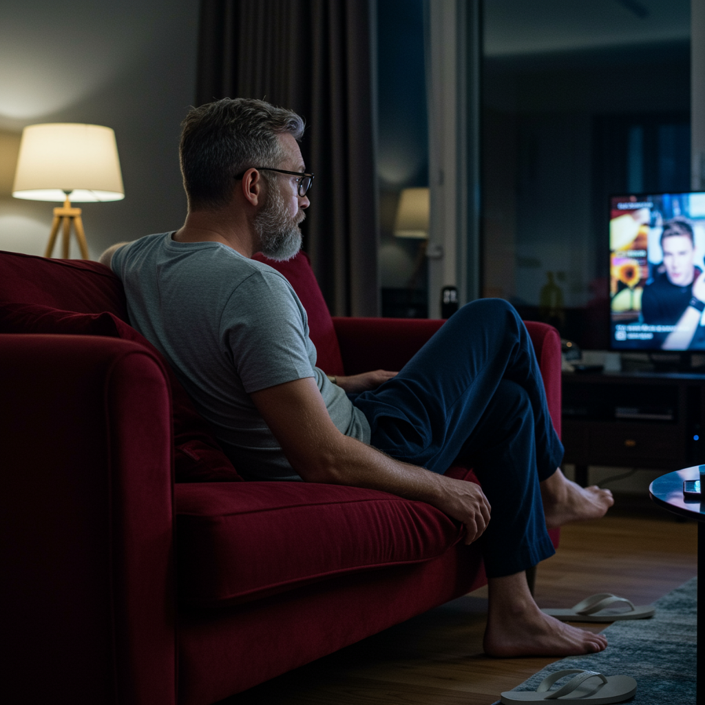 A 45-year-old Caucasian man with a salt-and-pepper buzz cut and a closely trimmed beard sits on a rich, burgundy velvet couch, intently watching TV in a sleek, modern living room illuminated by soft, ambient lighting. Viewed from behind, he sports chic, rounded rectangular glasses with matte black frames. He's comfortably attired in a snug, heather-gray T-shirt, navy-blue lounge pants, and barefoot, with a pair of white flip-flops casually placed on the floor nearby. The high-resolution scene captures the mood of a tranquil evening, blending photorealism with subtle artistic touches.