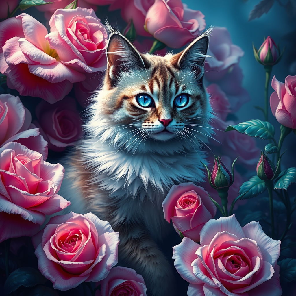 A 4K highly detailed digital painting of a blue-eyed cat perched gracefully in a rose garden, capturing the intricate essence of each petal and fur strand. Inspired by the styles of Kerembeyit, Hieronymus Bosch, and Dan Mumford, the scene blends fantastical elements with rich, vivid colors. The composition showcases an enchanting juxtaposition of the delicate roses and the vibrant, mystical aura of the cat, weaving a tapestry of surreal artistry that promises to mesmerize and captivate the viewer.