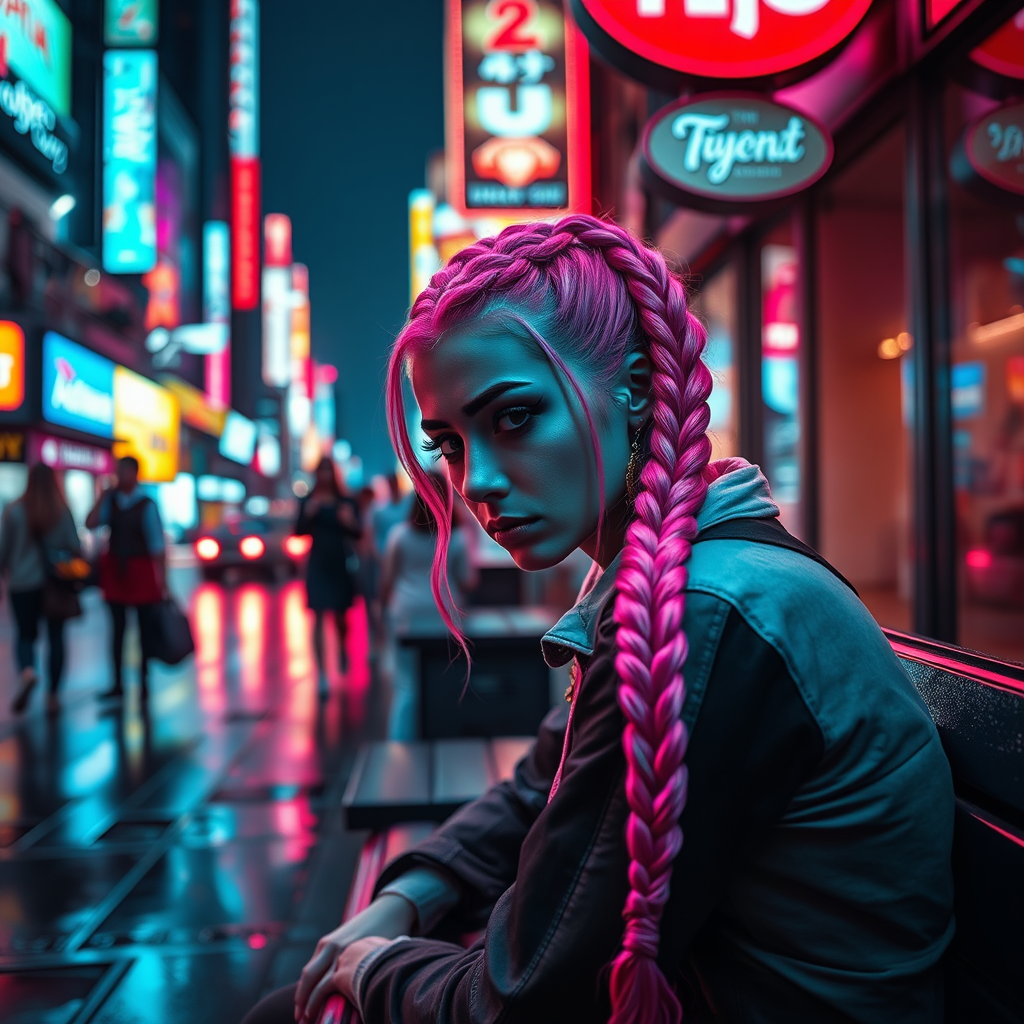 A 4k ultra-realistic scene captures a sad harlequin woman with heavy eyeliner, sitting on a bench in a vibrant cyberpunk city. Her glowing pink hair is intricately braided, casting a soft radiance against the city's neon-lit backdrop. The cinematic lighting highlights her forlorn expression as she gazes into the bustling world around her. People, blurred in motion, walk in the background, enhancing the sense of isolation amidst urban chaos, while the reflections of colorful billboards flicker on the damp street.