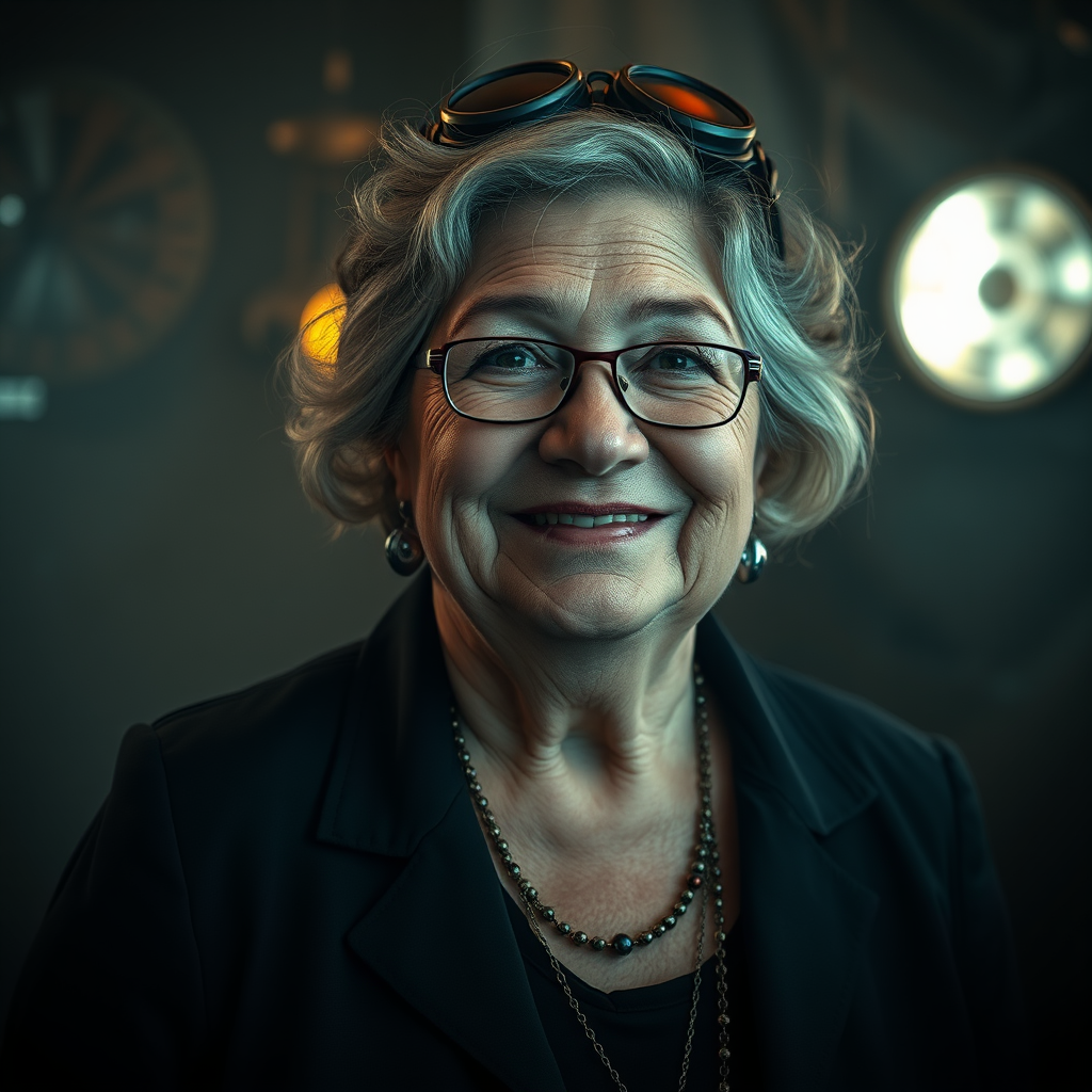 A 70-year-old, slightly chubby woman with a cheeky smile, inspired by the styles of Mark Citret, Guillermo Espinosa, Carl Frederik von Breda, Ed Benedict, and Sebastian Errazuriz. This image is set in a steampunk environment, utilizing negative space and color grading to create a cinematic film still with an analog style. The photo is captured in hyper-realistic detail with ultrarealistic UHD faces, at 8k resolution, using a DSLR camera with soft lighting, and film grain for texture. Photographed on a Fujifilm XT3 and an Olympus XA2 Camera, with an 85mm F/2.8 lens, employing HDR, volumetric lighting, and fog for a moist and dynamic atmosphere. The shallow depth of field highlights reflections in this fashion shot, which features a psychedelic and modular constructivism influence. The composition is realistic with attention to pretty hands and editorial cover art sensibilities. While ensuring high quality, the image avoids negative aspects like blur, poor lighting, and deformation, resulting in a well-composed, visually striking portrait.