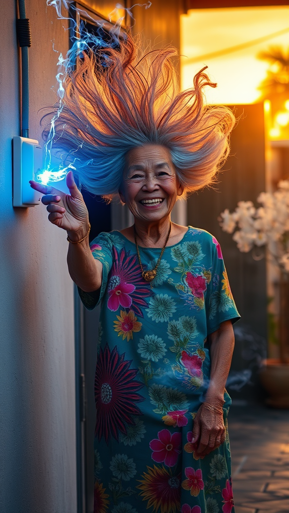 A 70-year-old woman in a vibrant batik dress and billowy sarong stands in front of her house, a whimsical smile on her face as she extends a manicured hand to touch a flickering electrical switch on the wall. Suddenly, a bright flash of blue light envelops her, sending her silver hair standing on end as it becomes entangled in a wild, electrocuted frenzy. A wisp of smoke escapes her wild hair, wisping upwards like a dervish, accompanying the chaotic dance of the smoke effects around her. Her face, once a warm, aged hue, darkens to a rich, charred brown, her expression still locked in a joyful laugh as she gives a triumphant thumbs up to the camera. In the background, the warm glow of sunset frame her static shot with mesmerizing colors. Alternatively, she steps outside on the porch instead of indoors for a fresher, more ethereal atmosphere, her wrestling with the electrical switch enjoys the faint sweet scents of freshly blooming flowers.
