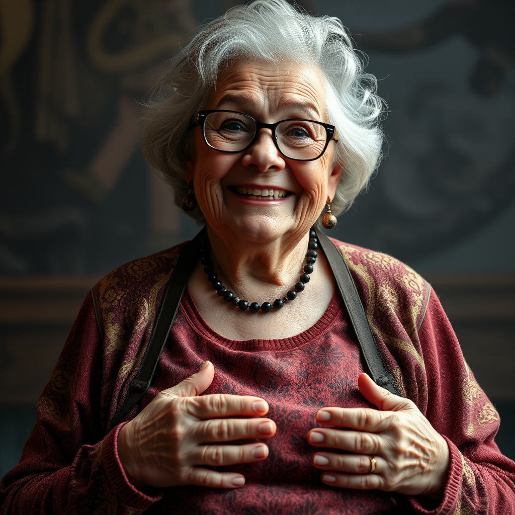 A 70-year-old woman with a blubbery physique and a cheeky smile, reminiscent of a teacher's warmth. Captured in the style of photographers Mark Citret and Guillermo Espinosa, and artists like Carl Frederik von Breda and Ed Benedict, this image embodies steampunk elements and utilizes negative space for dramatic effect. Showcased in a hyper-realistic, ultra-high-definition format, the scene is lit with soft, cinematic lighting reminiscent of analog film styles. The photograph is taken with a Fujifilm XT3 and an Olympus XA2 camera, using an 85mm lens at F/2.8, enhanced with HDR techniques. The atmosphere includes color grading and volumetric lighting and fog for texture. The setting reflects modular constructivism and a psychedelic flair, presented with realistic details in the hands and facial features. The composition is suitable for an editorial cover, maintaining high quality with film grain and reflections for depth. Avoiding any distortions, the image focuses on authenticity and vibrancy, ensuring a captivating and engaging visual narrative.