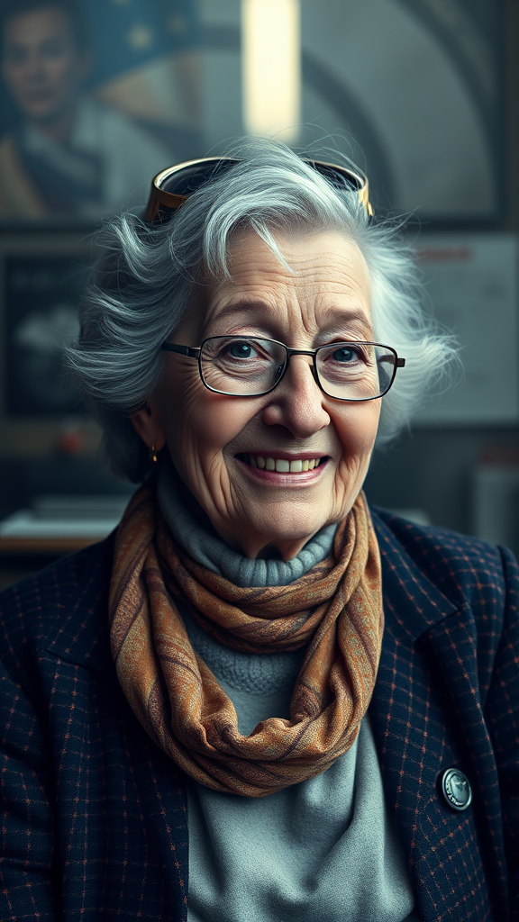 A 70-year-old woman with a blubbery yet charming presence, exuding the wisdom of a seasoned teacher and a cheeky smile that hints at a playful spirit. The scene is captured through the artistic lenses of Mark Citret, Guillermo Espinosa, Carl Frederik von Breda, Ed Benedict, Sebastian Errazuriz, and Colin Campbell Cooper. This steampunk-inspired image boasts negative space and an intricate color grading, reminiscent of a cinematic film still. The analog style, with hyper-realistic details, is captured in an 8k uhd quality photo. Soft lighting and authentic film grain add depth, enhanced further by the Fujifilm XT3 and Olympus XA2 Camera's capabilities, using an 85mm lens at F/2.8 for a rich HDR effect. Volumetric lighting and fog create a moist, atmospheric setting, with shallow depth of field and striking reflections. The frame achieves an absurdly high resolution with a fashion-forward shot, blending in a psychedelic Thomson MO5 color palette and Modular constructivism. The composition is reminiscent of high-end editorial cover art, with a focus on realistic, pretty hands. Despite its cinematic composition, it cleverly avoids the pitfalls of bad prompts, aiming for sheer artistic brilliance and captivating storytelling.