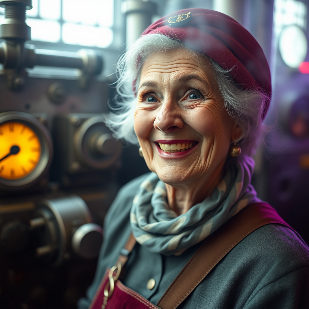 A 70-year-old woman with a cheeky smile, inspired by Mark Citret, Guillermo Espinosa, Carl Frederik von Breda, Ed Benedict, Sebastian Errazuriz, and Colin Campbell Cooper, captured in a steampunk setting. The image features a cinematic film still aesthetic with an analog style, presenting an ultra-realistic and hyper-real photo quality. Shot on a Fujifilm XT3 with an 85mm lens at F/2.8, the photograph incorporates soft lighting, film grain, and a shallow depth of field, enhanced by volumetric lighting and fog. The composition is rich with color grading and encapsulates the psychedelic Thomson MO5 color palette within a modular constructivism influence, offering a unique and artistic editorial cover feel. The high-resolution image avoids common pitfalls like poor lighting, blur, and distortion to showcase the woman's expressive personality in a flawless manner, bringing her vibrant story to life.