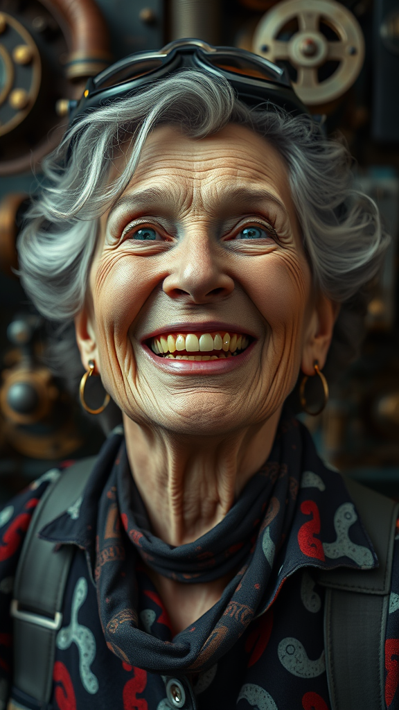 A 70-year-old woman with a lively and cheeky smile, inspired by the works of Mark Citret, Guillermo Espinosa, and Carl Frederik von Breda, set against a steampunk backdrop. Her whimsical expression is captured in a cinematic film still with analog style and hyper-realistic detail. The image showcases ultrarealistic UHD faces, shot in 8k on a DSLR with soft lighting, evoking a high-quality film grain effect. Photographed using a Fujifilm XT3 and Olympus XA2 camera with an 85mm lens at F/2.8, the scene employs HDR techniques to enhance volumetric lighting and misty atmospheric effects. The shallow depth of field emphasizes the absurd resolution of the fashion shot, with a psychedelic palette inspired by Modular Constructivism and the Thomson MO5, delivering a realistic yet artistic editorial cover image. Despite the complexity, the composition avoids typical photographic flaws like cropping, poor focus, or lighting issues, ensuring a captivating and immersive visual experience.