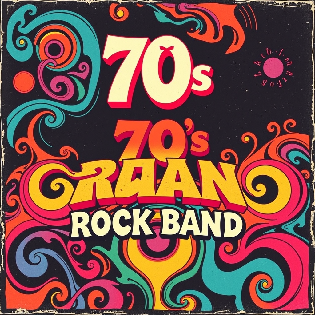 A 70's-inspired rock band album, featuring psychedelic artwork with swirling patterns and vivid, bold colors that capture the era's vibrant visual style. The design incorporates vintage elements, such as retro fonts and abstract shapes, creating an eye-catching and nostalgic cover that embodies the spirit of classic rock.