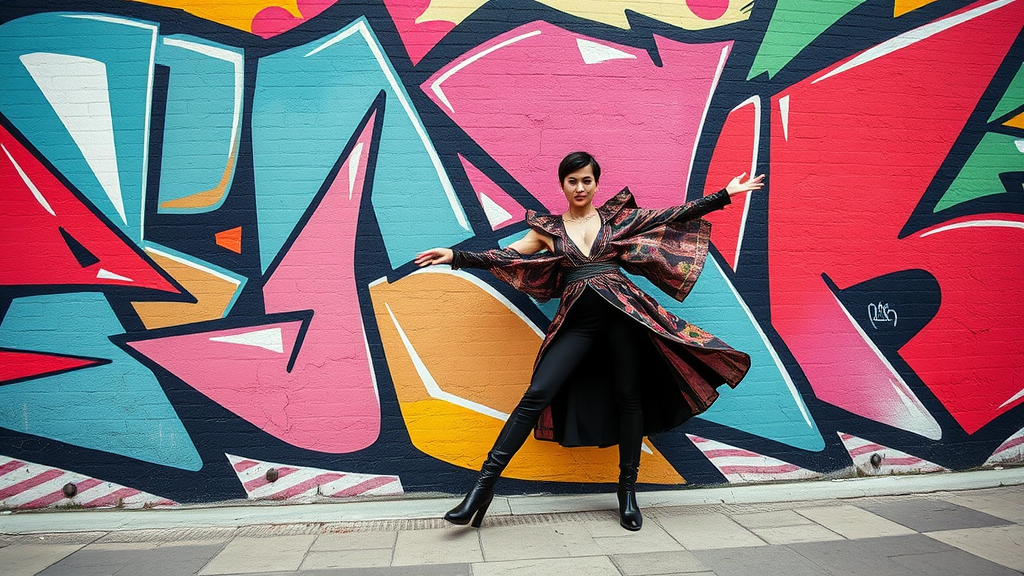 A 90s street photographer in Santiago captures a bold model striking dynamic poses against a vivid backdrop of abstract graffiti composed entirely of sharp, colorful geometric shapes. The model's attire, reminiscent of Tokyo Fashion Week, masterfully harmonizes with the graffiti through its intricate details and vibrant color palette, creating a mesmerizing fusion of art and fashion.