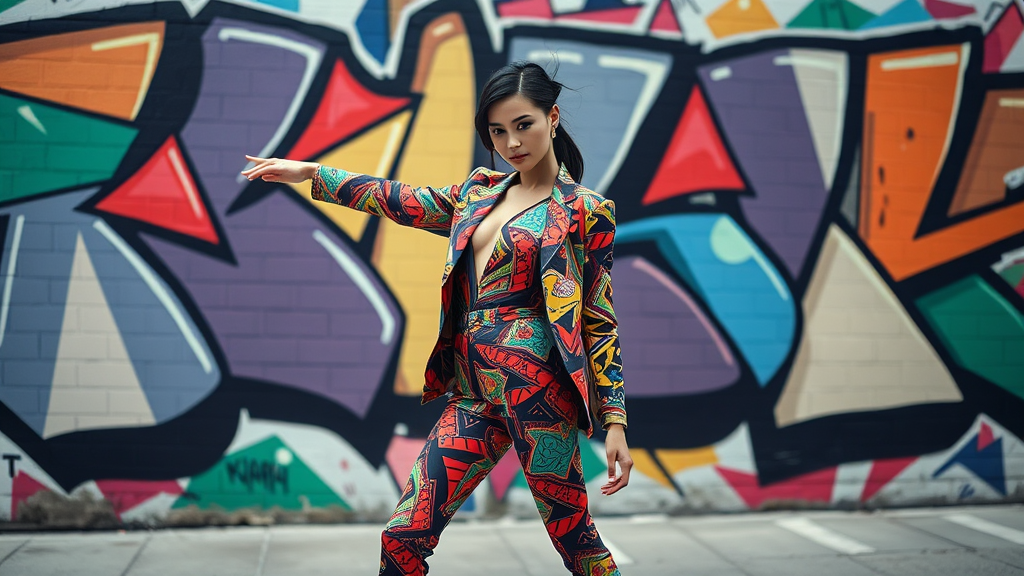 A 90s street photographer in Santiago captures a bold model striking a pose in front of vibrant graffiti composed of geometric, colorful shapes. The model's avant-garde outfit harmonizes with the mural in a stunning fusion of color and form, featuring intricate patterns reminiscent of Tokyo Fashion Week.