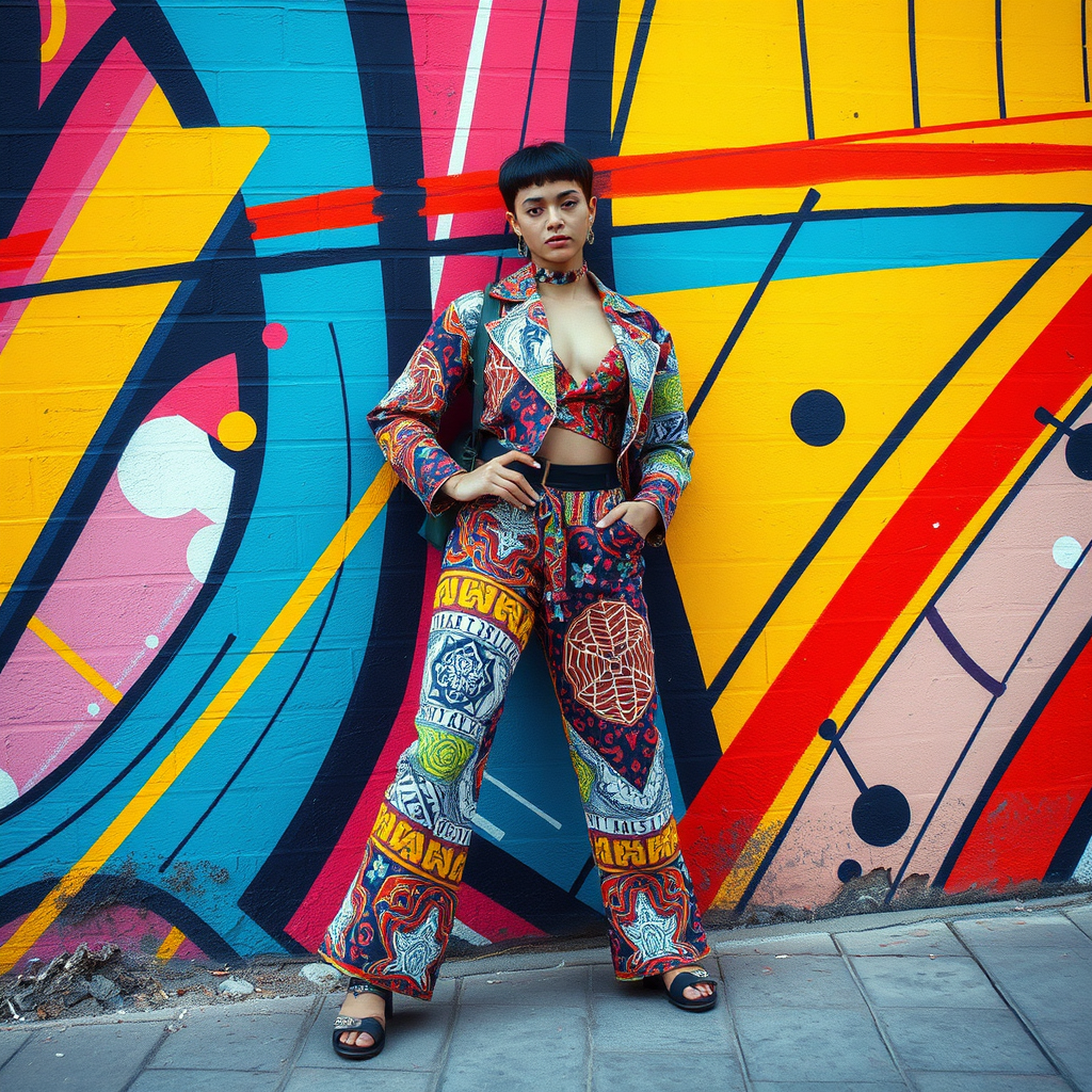 A 90s street photographer in Santiago captures a self-assured model posing dynamically against vibrant abstract graffiti composed entirely of bold, straight lines and vivid shapes. The model's outfit, with its dazzling array of colors and intricate patterns, perfectly harmonizes with the street art, evoking the avant-garde flair of Tokyo Fashion Week. Subtle hints of urban culture infuse the scene, creating a mesmerizing blend of style and environment.