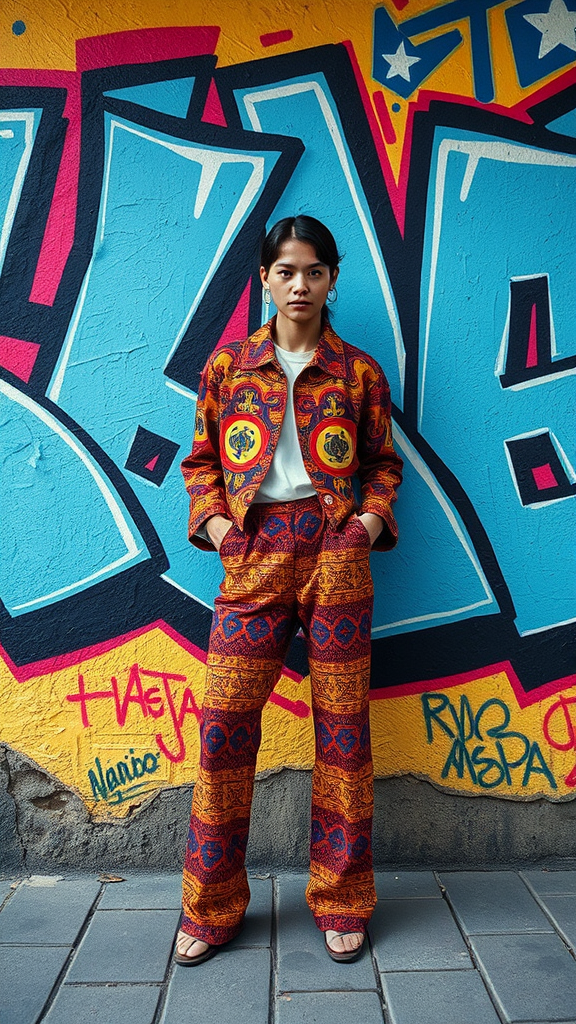 A 90s street photographer in Santiago captures a striking model exuding confidence in front of vibrant graffiti composed of bold, angular shapes. The outfit seamlessly merges color and form, with intricate patterns reminiscent of a Tokyo Fashion Week ensemble.