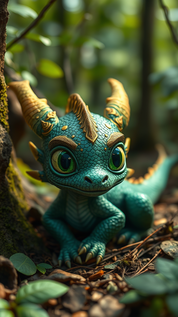 A baby dragon nestled in a forest clearing, its large green eyes shimmering with curiosity. The scene is adorned with intricate, whimsical details, capturing the essence of nature's magic. Its scales shimmer in hues of teal and gold, creating a striking contrast against the earthy tones of the forest. The dragon's skin exhibits sharp, prickly textures reminiscent of an imaginative ZBrush creation. Inspired by the artistic styles of Paul Barson and Kadir Nelson, the composition presents a series of close-up shots that emphasize the dragon's enchanting features and the forest's vibrant surroundings.